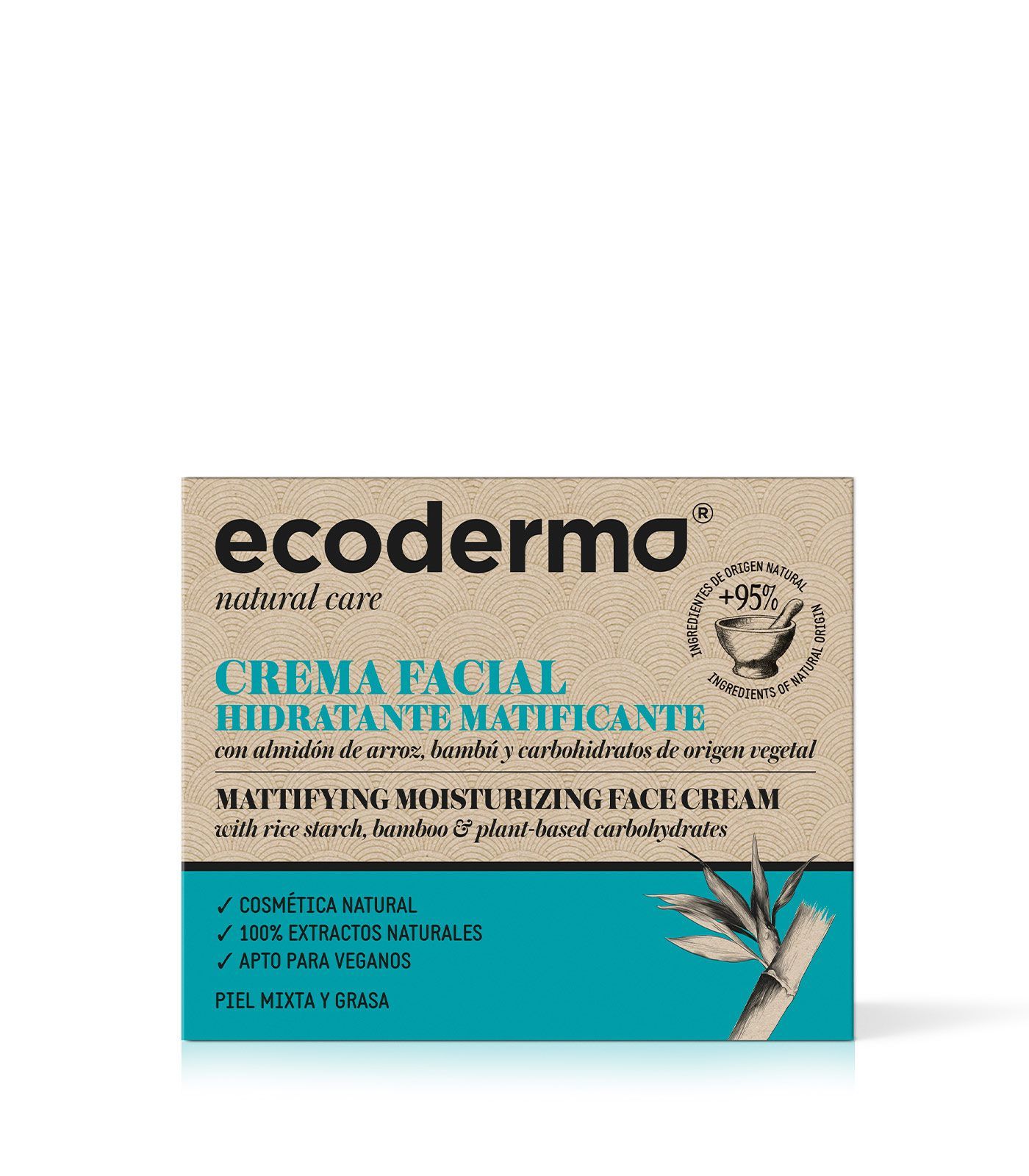 La Crema Facial Hidratante Matificante de Ecoderma, está elaborada con ingredientes activos de origen natural altamente eficaces a la vez que respetuosos con la piel y el medio ambiente. Su fórmula, con Almidón de Arroz, Bambú y Carbohidratos de origen vegetal, mejora el aspecto de las pieles mixtas y grasas. Para un rostro matificado de larga duración y sin brillos.
