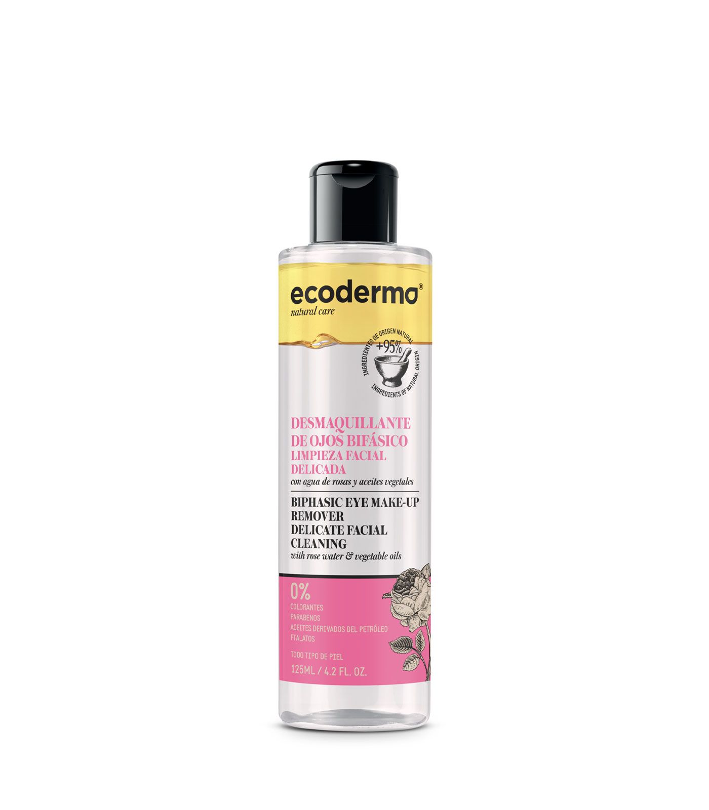 Rico en omega 6 y 9 y en vitaminas A, B, D y E. El Desmaquillante de Ojos Bifásico de Ecoderma es una mezcla de aceites vegetales nutritivos de origen natural. Su alto poder hidratante, debido a los ácidos grasos esenciales está indicado para la hidratación de pieles especialmente sensibles, la protección del pieles sensibles, así como para la cura de descamaciones e irritaciones que muchas veces están provocadas por falta de hidratación. Estas cualidades hidratantes, así como las vitaminas que nos ofrece hacen que de tersura y elasticidad a la piel, evitando el envejecimiento prematuro de la misma, así como la protección celular frente a los radicales libres, y es que la vitamina A y E tienen un efecto inmediato en las células que componen la piel, ayudando a recuperar el buen estado y la salud de los tejidos más externos de la piel. Junto esto nos ayuda a mejorar y estimular la producción de colágeno de manera natural y de elastina.